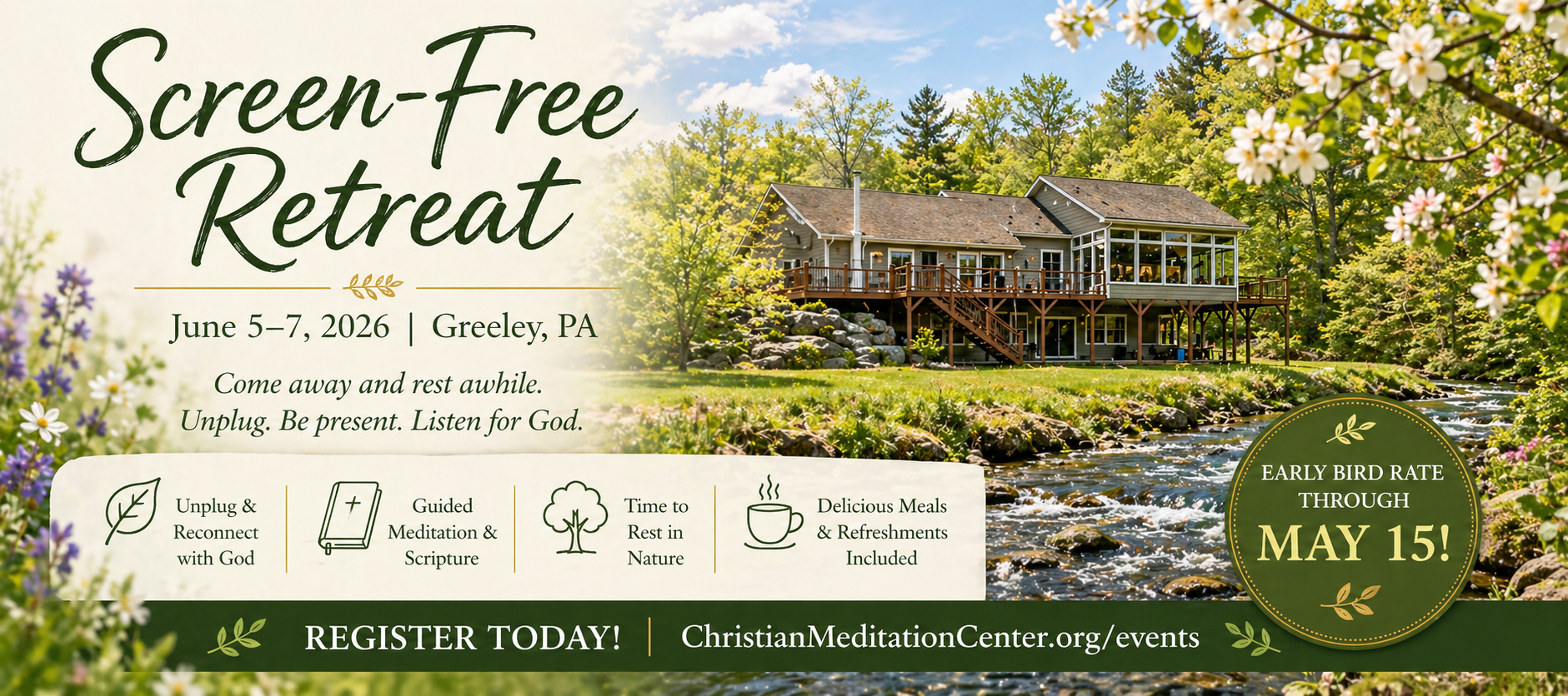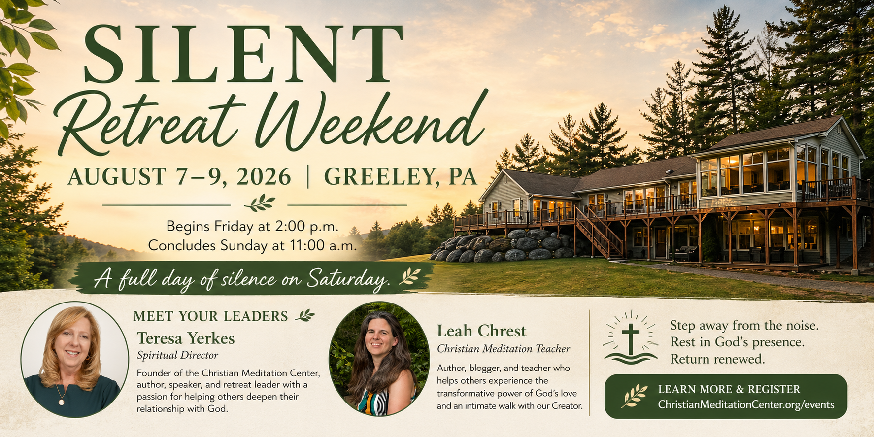 Join us for a peaceful Silent Retreat Weekend in Greeley, PA, August 7–9, 2026. Beginning Friday at 2 p.m. and ending Sunday at 11 a.m., this retreat offers a gentle rhythm of community and solitude, with a full day of sacred silence on Saturday. Guided by Teresa Yerkes, Spiritual Director, and Leah Chrest, Christian Meditation Teacher, you’ll be invited to rest in God’s presence through meditation, prayer, and quiet reflection. Step away from the noise and return renewed, grounded, and at peace.